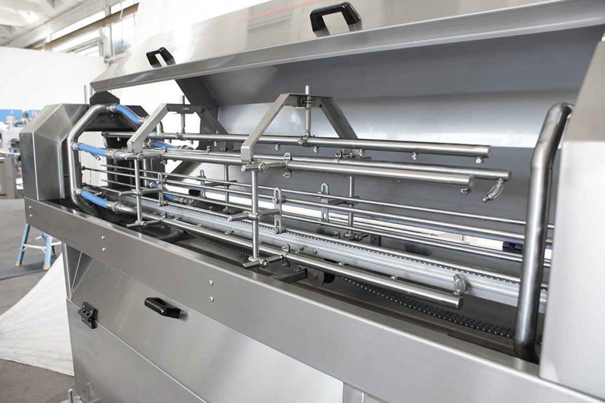 La soffiante è in grado di eseguire, a seconda delle necessità, il soffiaggio oppure il lavaggio interno dei contenitori in modo da garantire la loro completa pulizia interna. Realizzabile in diverse versioni a seconda del trattamento da utilizzare per l’insufflazione di: aria filtrata, aria sterile, acqua o vapore. La soffiante è regolabile in larghezza senza necessità di sostituire alcun pezzo per il cambio formato, con altezza ingresso/uscita contenitori variabile, o lineare a twist.